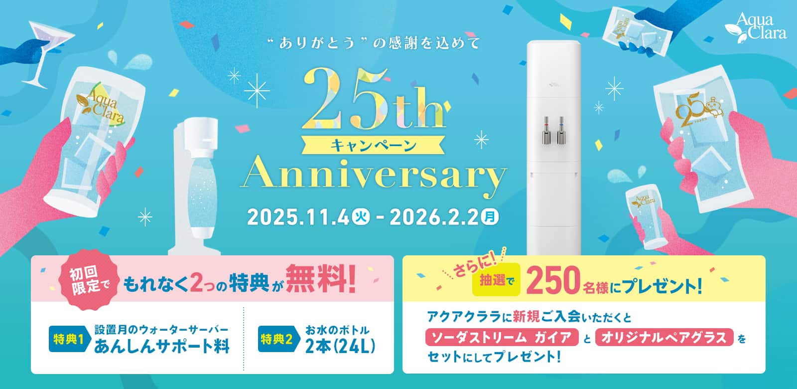 | 特典内容 | 「あんしんサポート料」「お水12Lボトル2本」どちらも初月0円!さらに抽選で250名様にソーダストリームガイアが当たる(2026/2/2まで) |