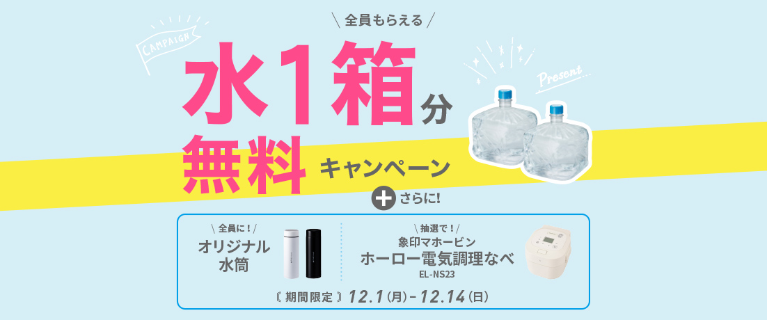 | 特典内容 | 水1箱分無料 オリジナルグッズプレゼント 抽選で象印マホービンホーロー電気調理鍋プレゼント |
